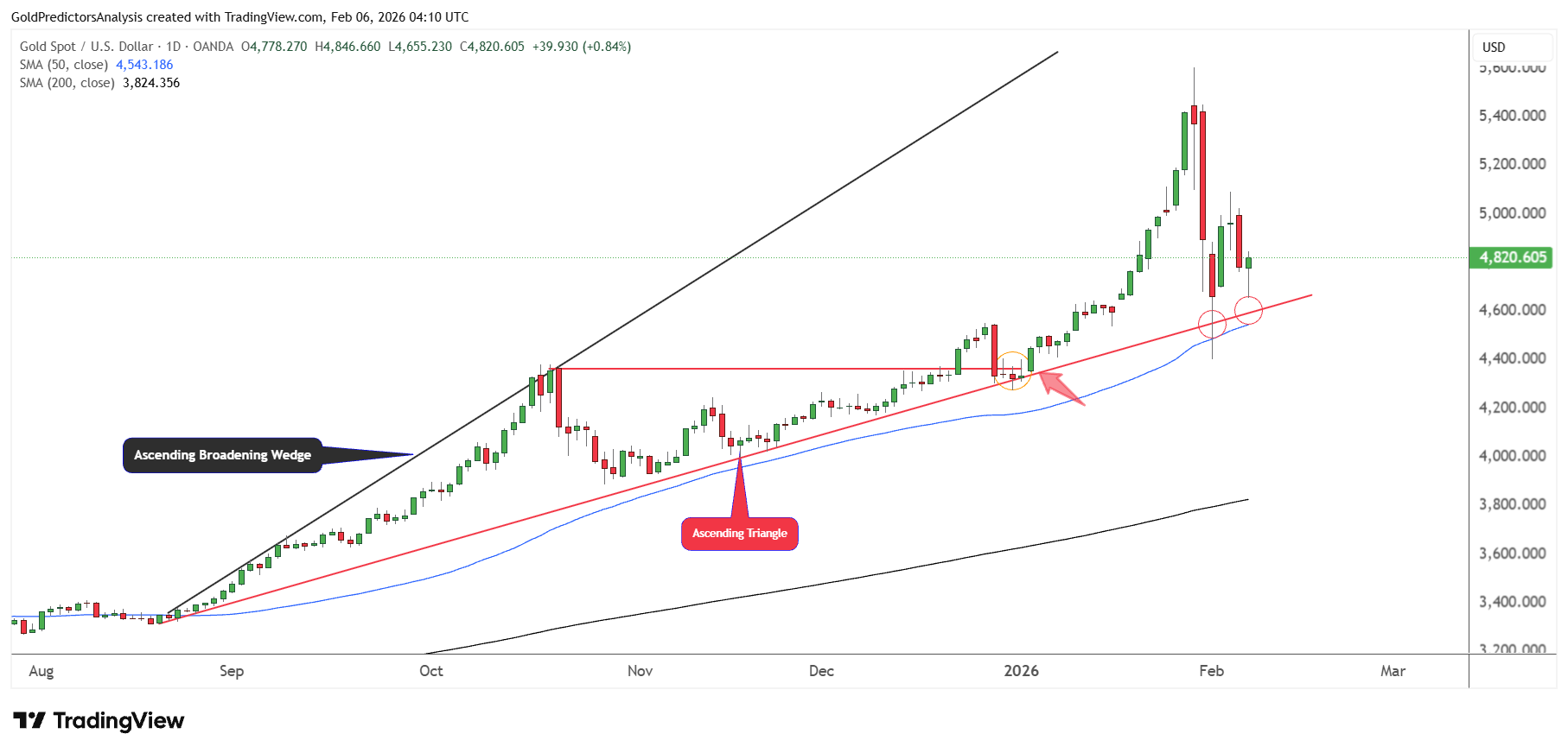 در نمودار روزانه طلای نقدی، قیمت پس از سقوط سریع از محدوده ۵۶۰۰ دلار تا سطح ۴۴۰۰ دلار، با واکنش صعودی مواجه شده است. این بازگشت ناشی از وجود حمایت قدرتمند در محدوده ۴۴۰۰ دلار است؛ سطحی که محل تلاقی میانگین متحرک ۵۰روزه با خط حمایتی الگوی «پوشای صعودی» محسوب میشود.