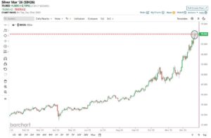 بر اساس دادههای بازار کامکس، قرارداد آتی نقره تحویل مارس ۲۰۲۶ با رشد بیش از ۲ درصدی، در محدوده ۷۰ دلار معامله شد. این سطح قیمتی، بالاترین قیمت نقره در سالهای اخیر محسوب میشود و نشاندهنده افزایش تقاضا در بازار جهانی است.